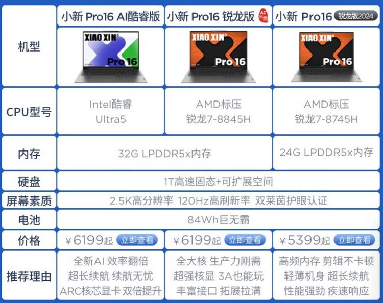 回到笔记本本身,联想小新 Pro 14 新配置搭载锐龙7 8745H 处理器,有 24GB LPDDR5X 板载内存和 1TB 储存,集成84Wh 大电池,配备2.8K 高刷 OLED 屏,120Hz 刷新率,首发价 5199 元;个头大一些的 Pro 16 处理器、内存和储存一样,但还可额外添加一块SSD,搭载2.5K 高刷护眼屏,也配备84Wh 大电池,首发价 5399 元。