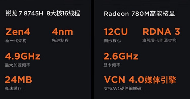 具体来说,锐龙7 8745H采用台积电4 nm 工艺,ZEN 4 架构,为8核心/16线程,最大可加速至4.9GHz,配备24MB 缓存。另外,集成 Radeon 780M 核显,RDNA 3 架构,12CU 计算单元,最高频率为 2.6GHz,支持AV1硬件编解码。