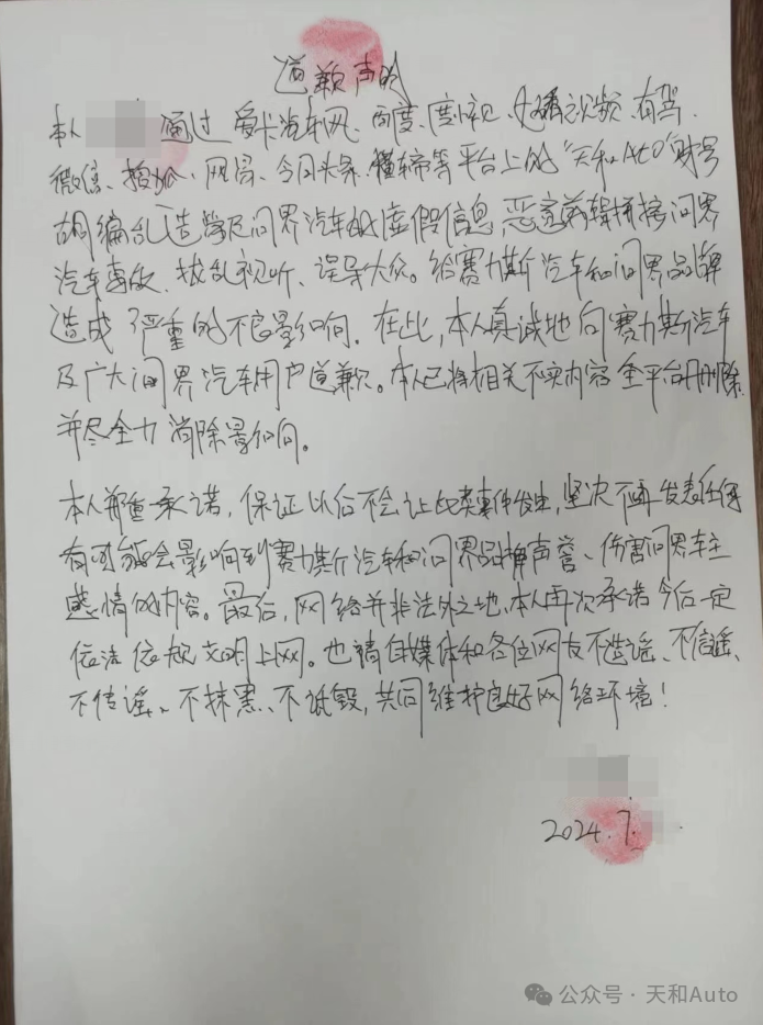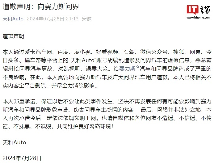7 月 29 日消息,昨晚,自媒体博主“天和 Auto”发布道歉声明,称其通过爱卡汽车网、百度、度小视、好看视频、有驾、微信公众号、搜狐、网易、今日头条、懂车帝等平台上的“天和 Auto”账号胡编乱造涉及问界汽车的虚假信息,恶意剪辑拼接问界汽车事故,扰乱视听,误导大众。