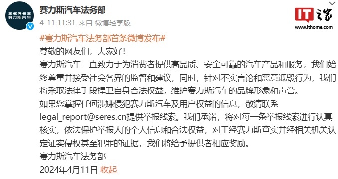 注意到,赛力斯汽车发布会于今年 4 月发布首条微博,称赛力斯汽车始终尊重并接受社会各界的监督和建议,同时针对不实言论和恶意诋毁行为,赛力斯将采取法律手段捍卫自身合法权益,维护赛力斯汽车的品牌形象和声誉。