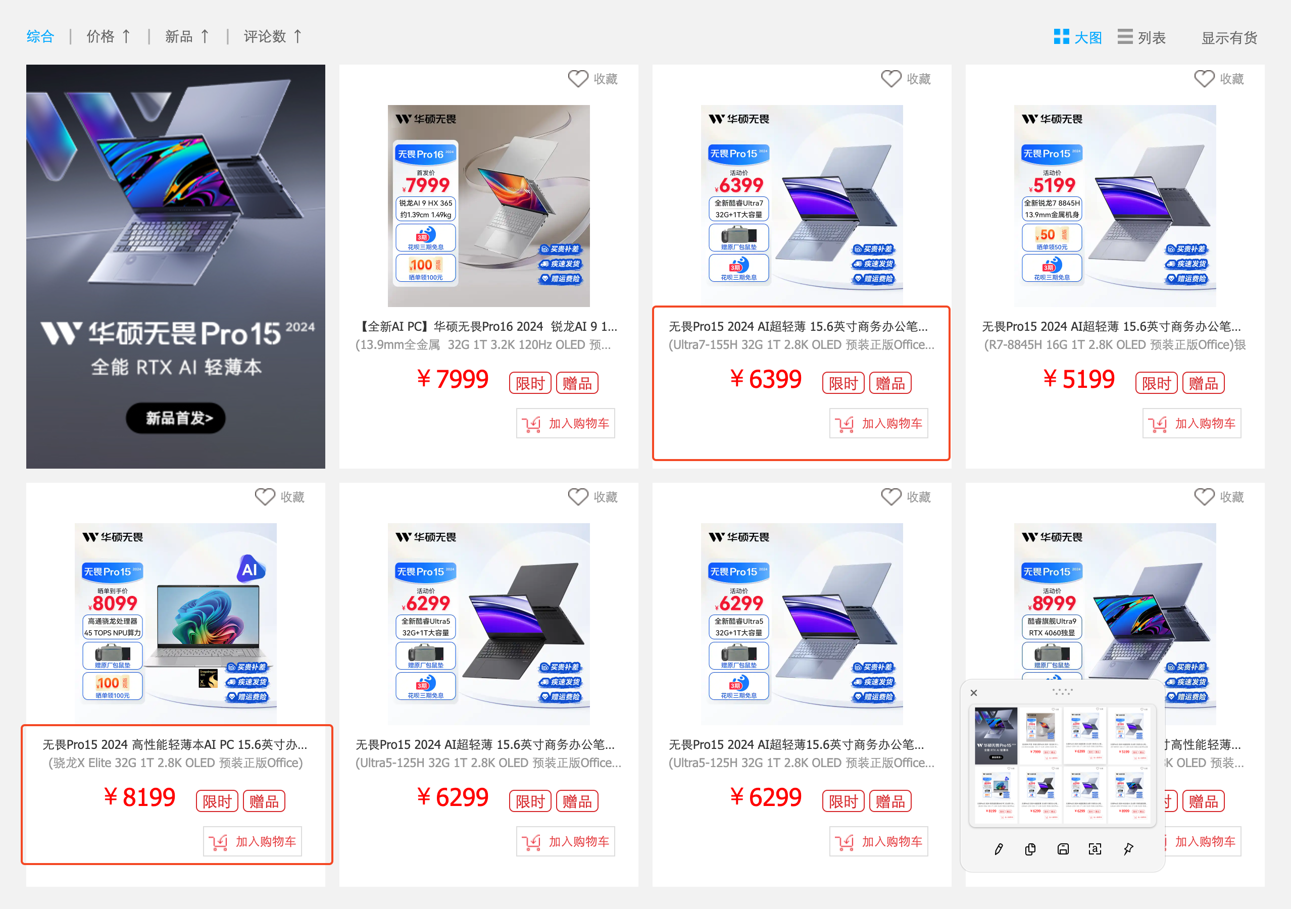所有公开价格的机型中,目前最便宜的是华硕无畏 Pro16 2024,但起售价也要 7999 元。