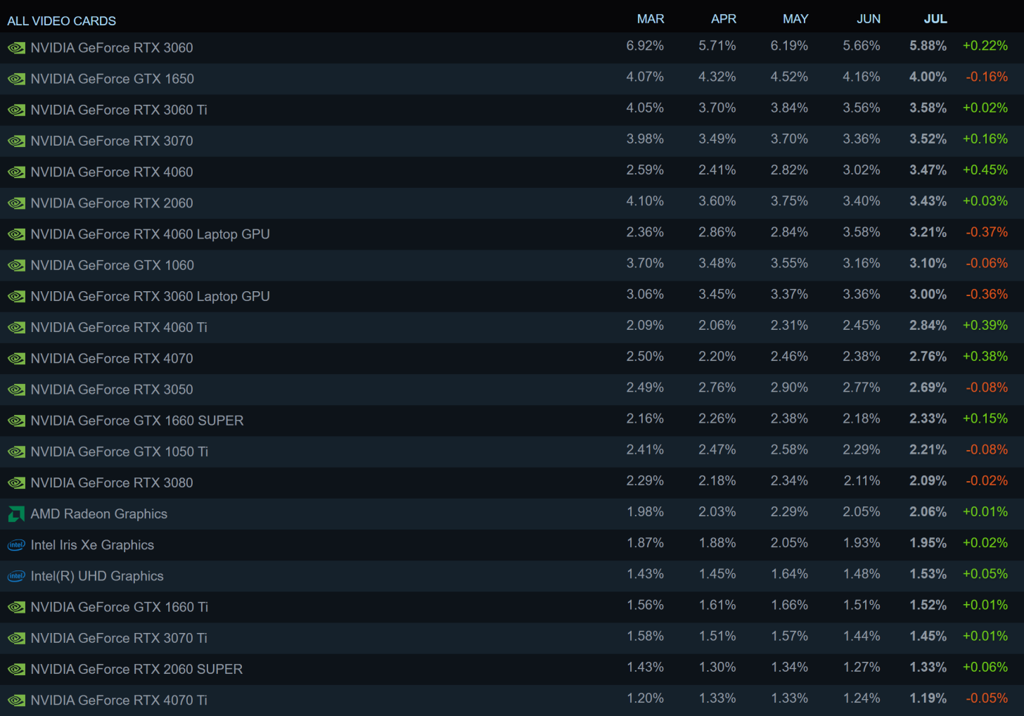 IT之家注意到,RTX 3060 不仅是众多零售商的销量冠军,同时也是 Steam 平台 7 月硬件调查中最受欢迎的显卡。该显卡的受欢迎程度较上个月增长了 0.22%,目前用户占比为 5.71%。虽然 Steam 硬件调查的数据并不完全准确,但从过去几个月的趋势来看,RTX 3060 一直稳居榜首,紧随其后的是 GTX 1650 和 RTX 3060 Ti 等其他入门级显卡。
