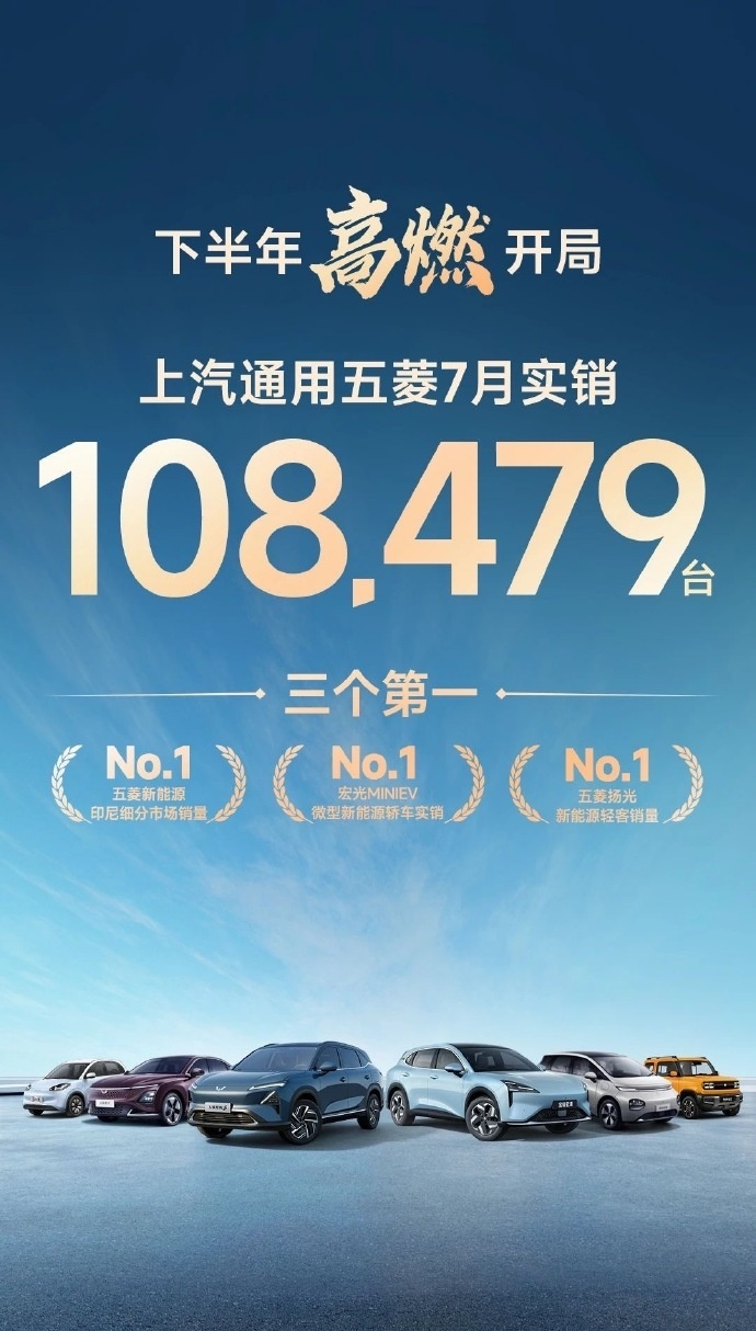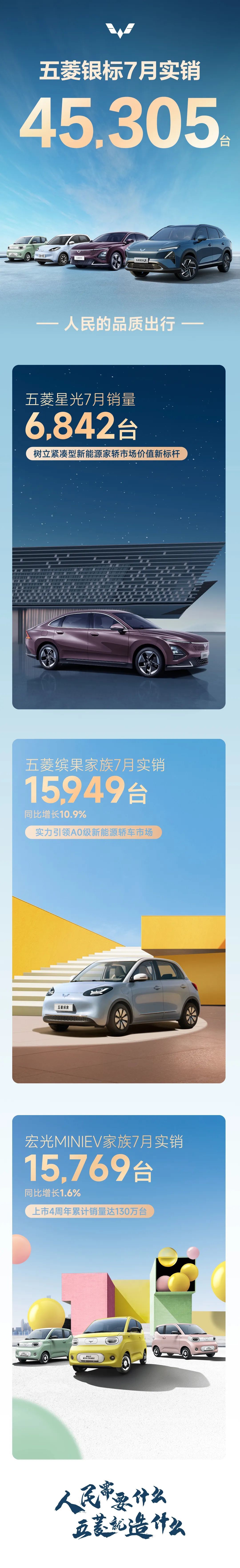 8 月 3 日消息,上汽通用五菱汽车今日宣布,五菱银标 7 月实销 45305 辆,其中五菱星光销量 6842 辆,五菱缤果家族销量 15949 辆,同比增长 10.9%;宏光 MINIEV 家族销量 15769 辆,同比增长 1.6%。