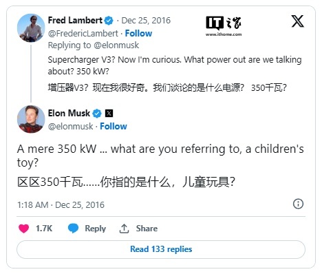 早在 2016 年,有网友提问称 V3 超级充电站是否能够实现 350 千瓦的充电功率,特斯拉 CEO 埃隆・马斯克当时回应称 350 千瓦只是“小儿科”。不过,最终 V3 超级充电桩的功率限制在 250 千瓦。虽然这对特斯拉车型来说足够,但特斯拉已经向非特斯拉电动汽车开放充电网络,许多车型能够接受 400 千瓦的充电功率,且其他充电站也具备这一能力。
