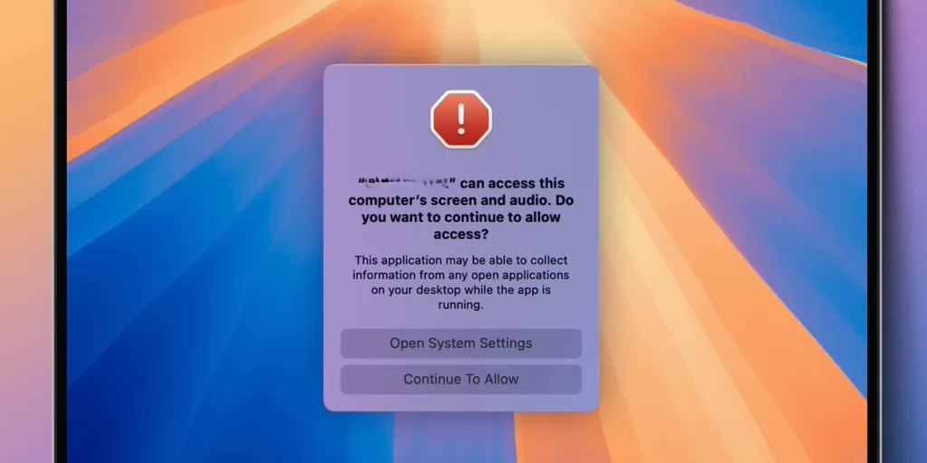 IT之家注意到,新系统弹窗将明确告知用户,该应用程序可以访问电脑的屏幕和音频,并可能收集桌面上所有打开应用的信息,用户可以选择继续允许访问或前往系统设置修改权限。