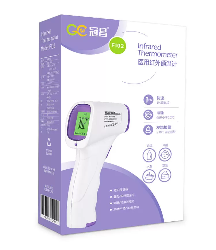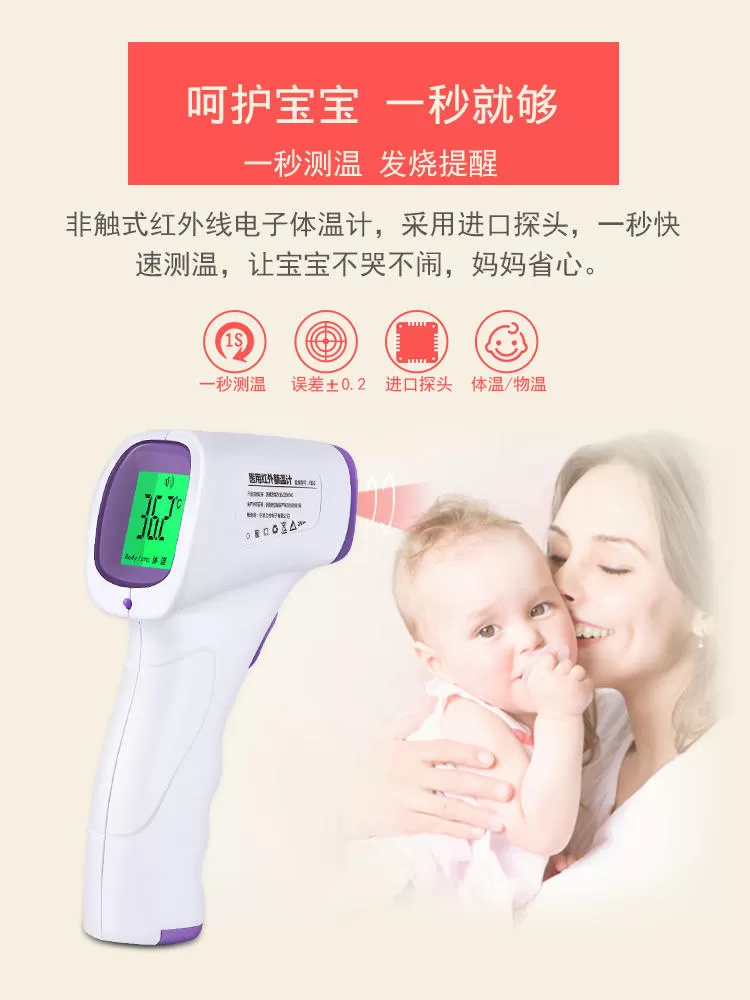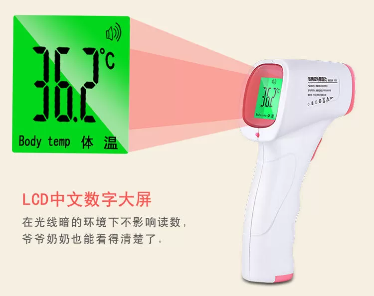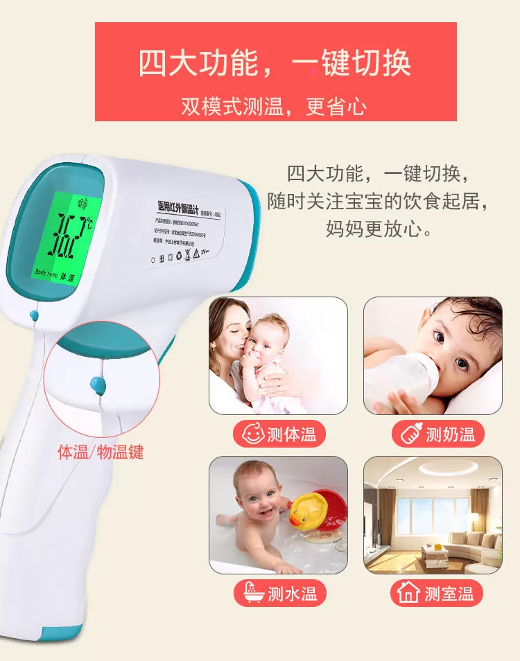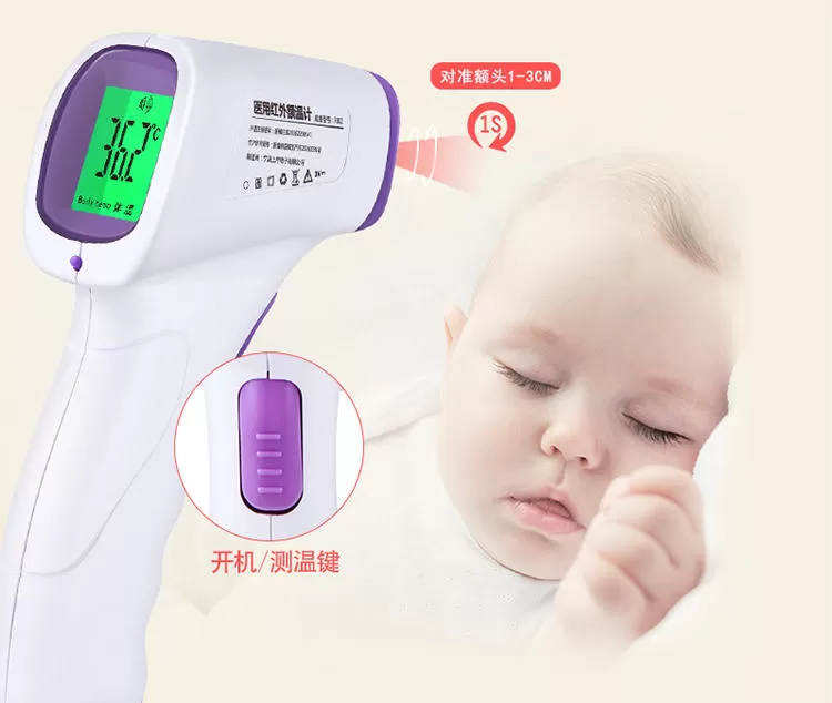 使用的方法很简单,仅需要把它对准额头上,然后按下设备上把手按钮,接着等待它提示测量完毕即可。结果会以摄氏度显示在LED 屏幕上。不需要与宝宝的身体接触,只需要对着宝宝按键,便可快速准确的测量体温,有效避免宝宝生病时出现交叉感染的情况。体温计通过吸入人体散发的红外热量来测量,不产生红外辐射,使用更加方便快捷。