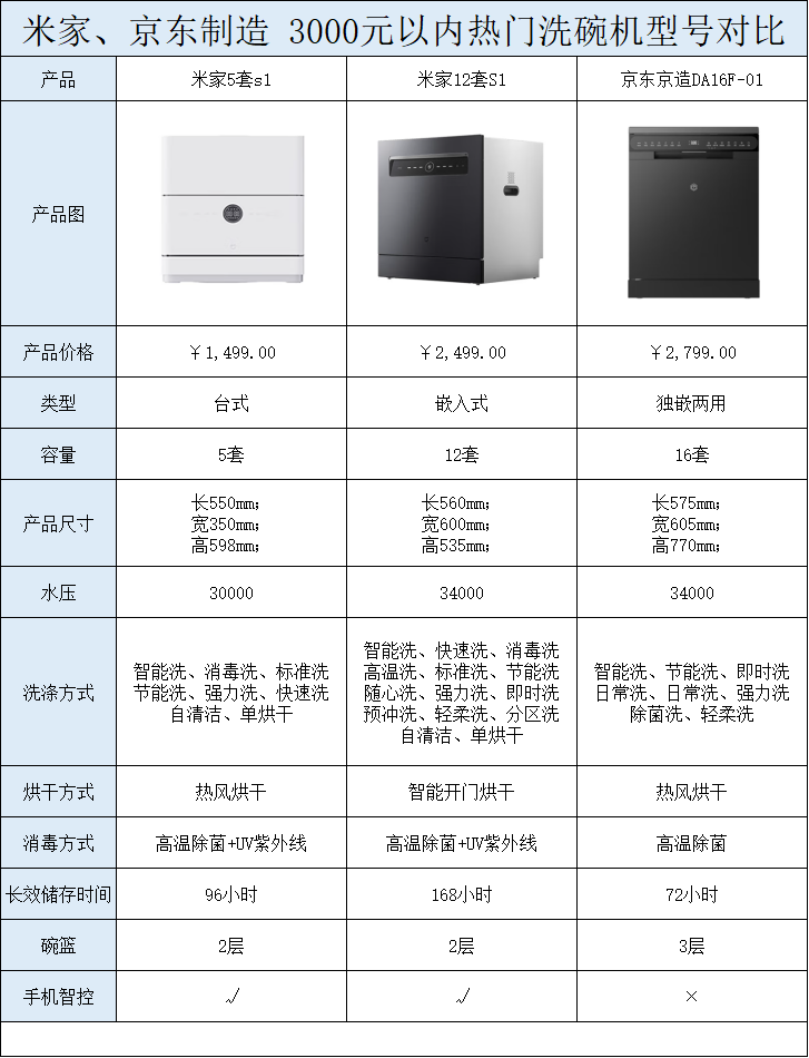 今天小编就给大家盘点了三款好用、大牌的3000元以内洗碗机,它们分别是米家5套s1、米家12套S1、京东京造DA16F-01.以下是这三款产品的具体参数: