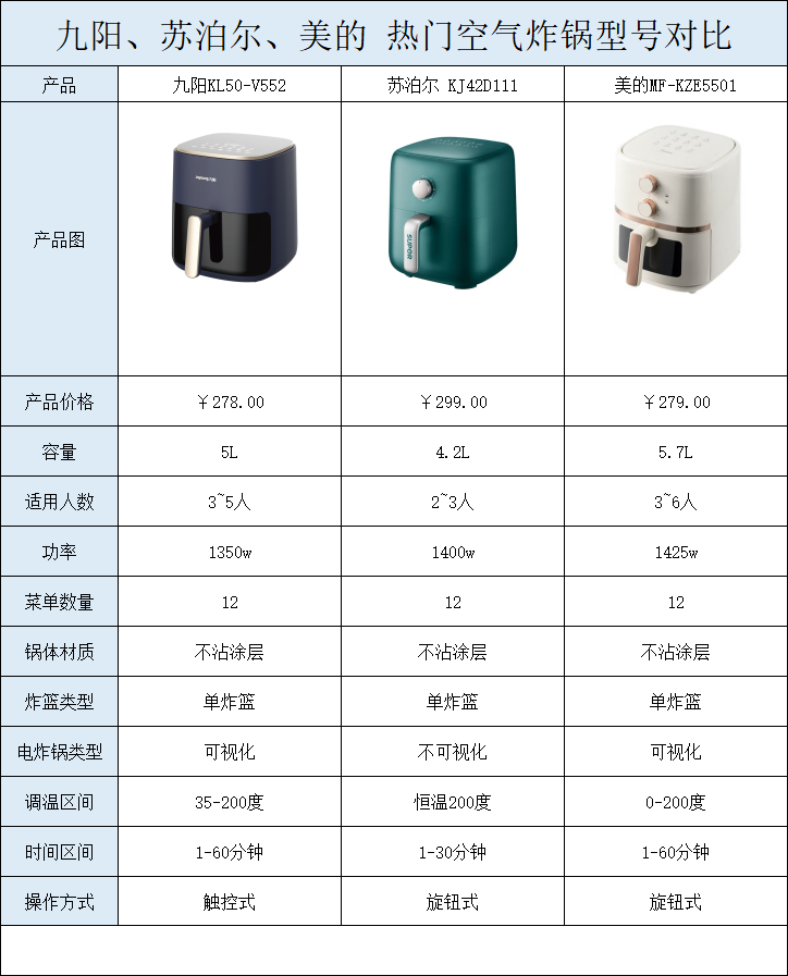 今天小编就给大家测评了几款比较热门的空气炸锅产品,它们均是大牌,并且价格都在三百元以内,不管从品牌度还是品质上都是十分优秀的,它们分别是九阳KL50-V552、苏泊尔 KJ42D111、美的MF-KZE5501.以上是这三款产品的具体参数分析: