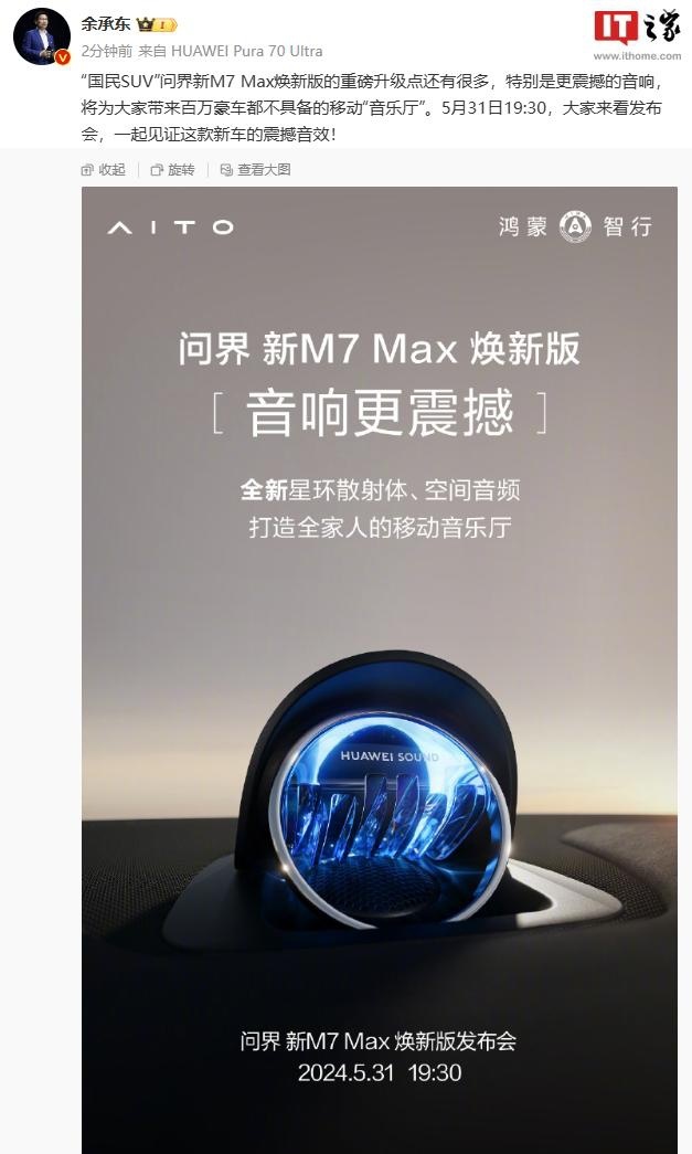 IT之家 5 月 27 日消息,华为余承东今日发文称,问界新 M7 Max 焕新版将为大家带来百万豪车都不具备的移动“音乐厅”,5 月 31 日 19:30 发布会揭晓。