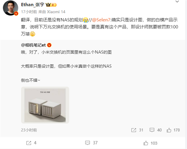 小米中国区智能硬件市场负责人通过社交媒体表示,所展示的“万兆NAS”仅为设计图,用作白模示意,用以说明万兆交换机的使用场景。该负责人明确指出,小米目前并没有推出NAS产品的规划。
