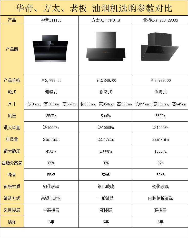 所以今天小编就给大家整理了几款好用的品牌油烟机,这几款油烟机价格都在三千以下,且都是知名大牌,销量高、好评多,它们分别是华帝i11135、 方太01-JCD10TA、老板CXW-260-28D3S,以下是这三款产品的具体参数: