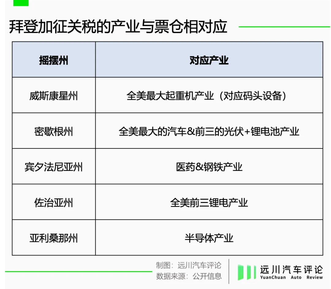 在这轮针对中国的贸易打压中,除了电动车,动力电池、光伏、医疗产品、起重机等产品的关税也被上调至25%或50%,这些产业与拜登想争取的票仓几乎一一对应。