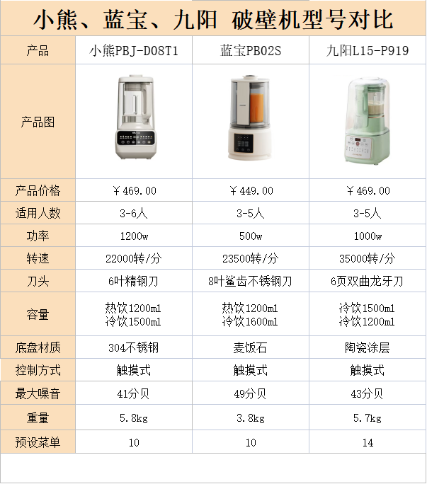 今天小编就给大家推荐几款500元以内,高性价比、运行噪音小、质量好、有保障的品牌破壁机。它们分别是小熊PBJ-D08T1、蓝宝PB02S、九阳L15-P919.这三款产品具体参数如下: