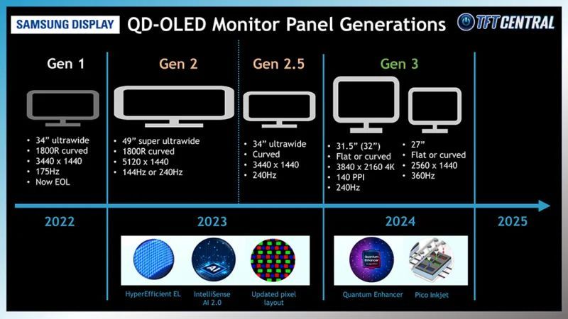 三星显示在官方新闻稿中表示,全新的 240Hz QD-OLED 面板将采用与 2 代(2023 年生产)和 3 代(2024 年生产)面板相同的更新像素结构,从菱形子像素变为更大、更方正的形状,这一变化有助于提高文字清晰度,减少这些面板上的花边。