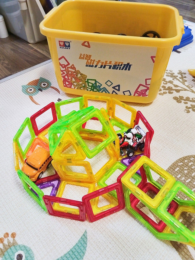磁力片设计,便于儿童进行创意搭建和拼插。家里小朋友特别喜欢这套磁力片积木,最近基本每天回家都要玩一阵,开放性玩具,想怎么玩就怎么玩~