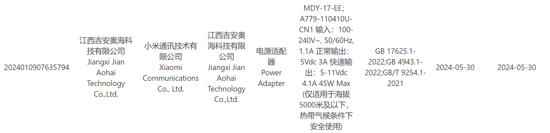 据 6 月 3 日最新媒体消息,日前,一款型号为 MDY-17-EE 的小米充电器通过国内 3C 认证,这意味着新品有望近期上市或搭配新机使用。