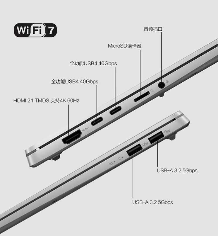 最后是接口,无畏Pro15 2024骁龙版提供双全功能USB4 40Gbps、双USB-A 5Gbps、HDMI 2.1 TMDS、SD读卡器、音频接口等,满足拓展需求。