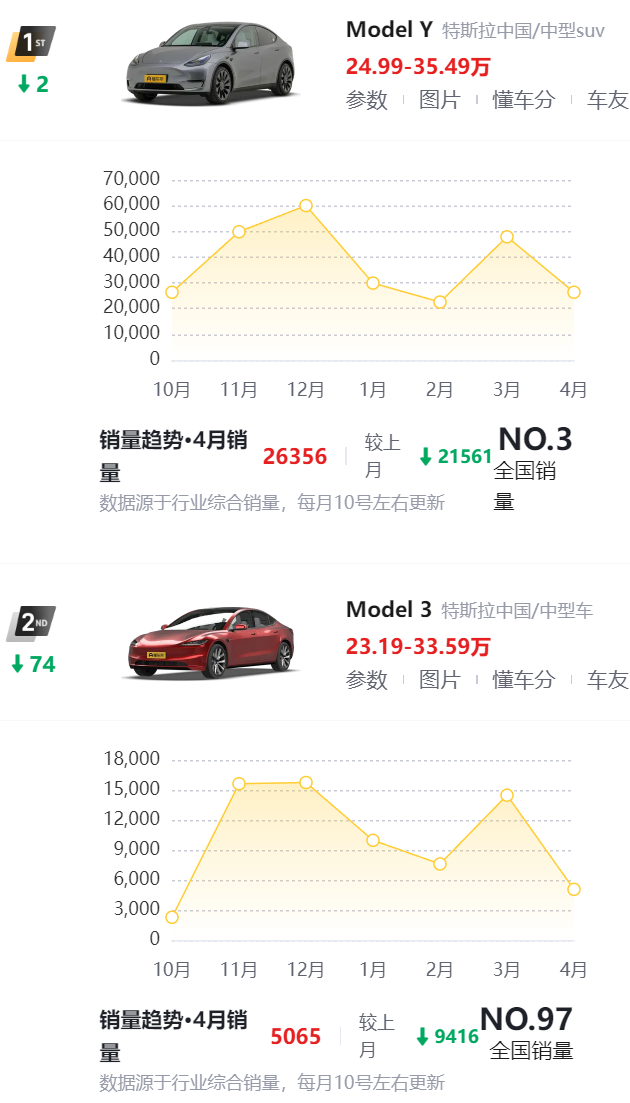 今年 1-4 月,特斯拉卖了 16.4 万台,相较去年同期下降了 7.3% 。特别是 Model 3 , 2022 年单月能月销 3 万,到了去年最多单月卖出 2 万,今年最高是 1.4 万。