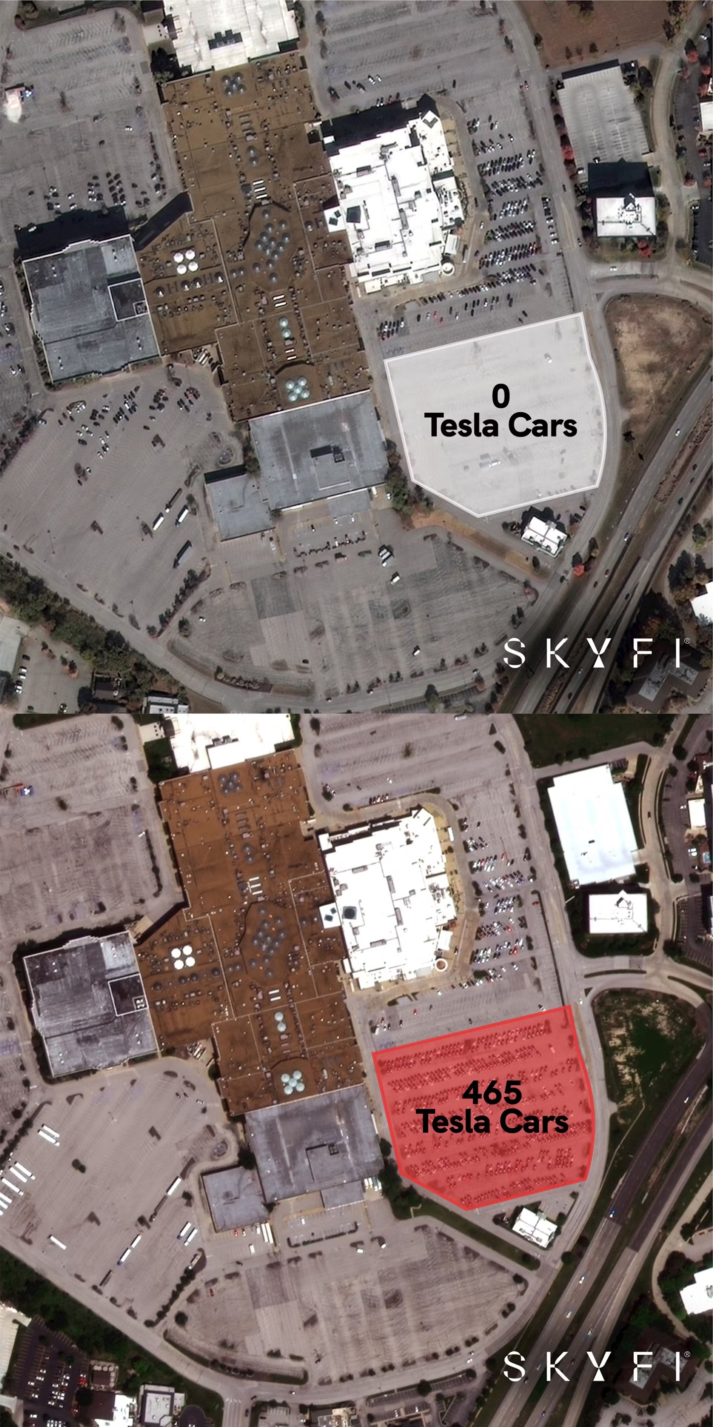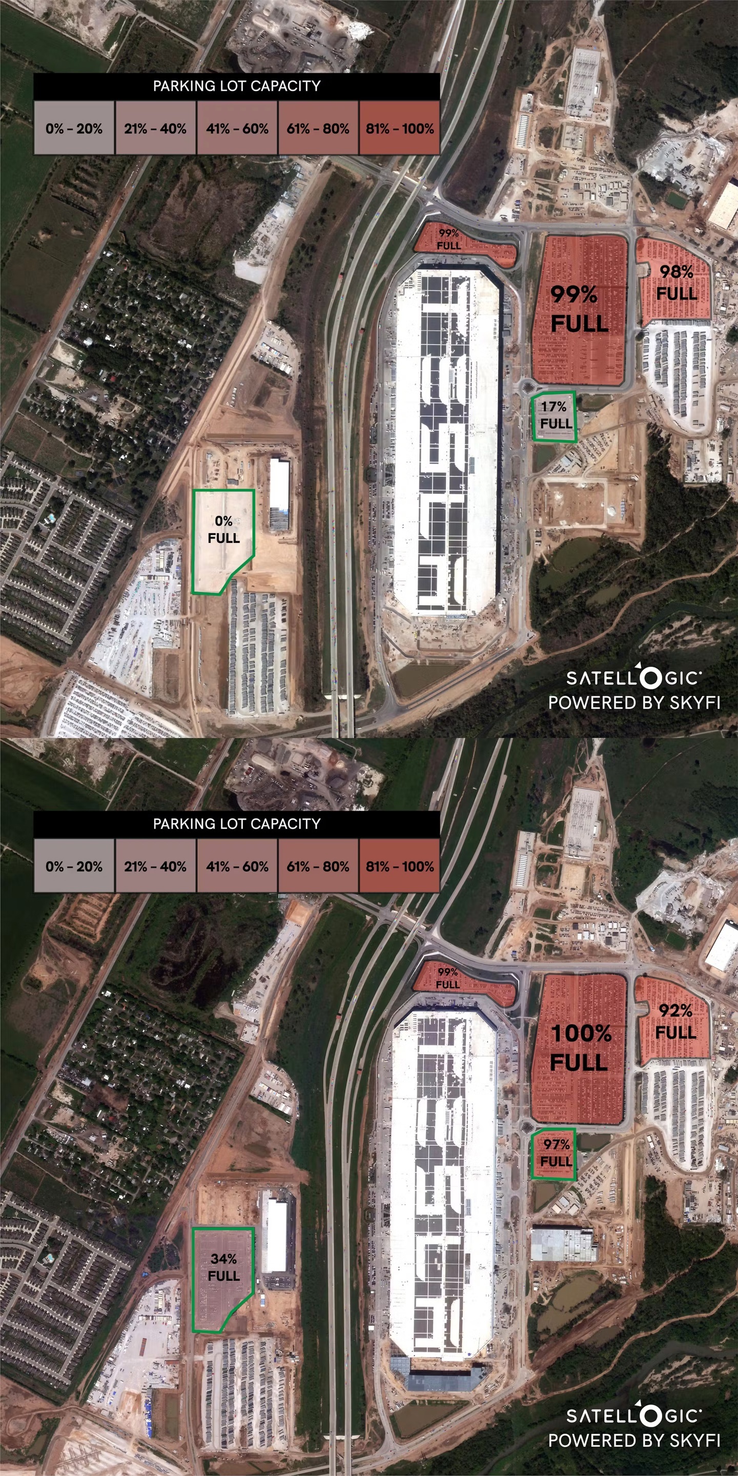 那么,这些堆积如山的特斯拉到底存放在哪里呢?答案是露天停车场。Sherwood 利用 SkyFi(一家卫星图像交易市场)提供的图像,发现了特斯拉汽车的存放地点。通过对比 2023 年 10 月和 2024 年 3 月的得克萨斯超级工厂卫星图像,可以看到工厂周围的停车场已经从部分或几乎满员的状态变成了完全堆满。