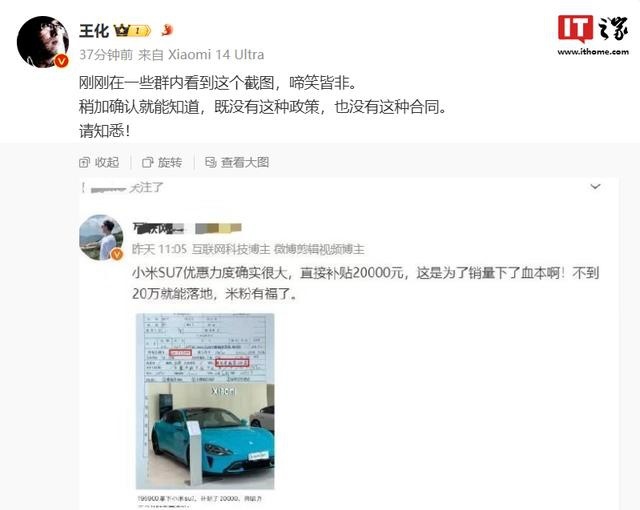 IT之家 6 月 10 日消息,有传闻称小米 SU7 优惠力度很大,直接补贴 20000 元,20 万就能落地。对此,小米集团公关部总经理 @王化 转发该消息并辟谣称:“刚刚在一些群内看到这个截图,啼笑皆非。稍加确认就能知道,既没有这种政策,也没有这种合同。请知悉! ”