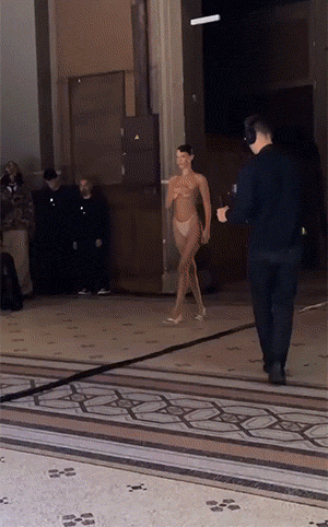 巴黎时装周Coperni秀场直接给Bella-Hadid在现场喷漆出一件礼服