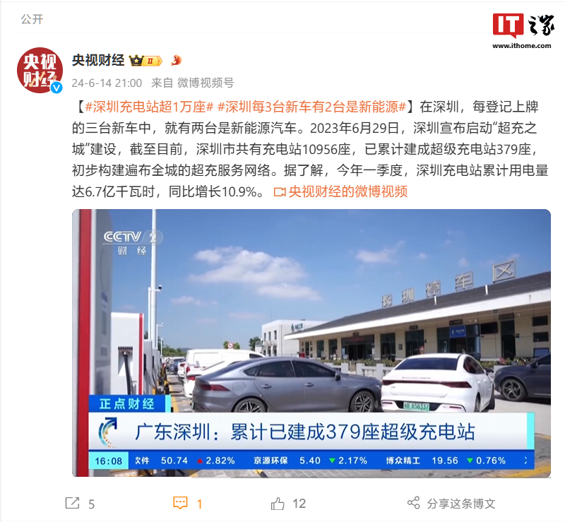 IT之家 6 月 15 日消息,据央视财经周五报道,2023 年 6 月 29 日,深圳宣布启动“超充之城”建设,截至目前,深圳市共有充电站 10956 座,已累计建成超级充电站 379 座,充电枪数量已超过传统的加油枪,初步构建遍布全城的超充服务网络。在深圳每登记上牌的 3 台新车中,就有 2 台是新能源汽车。