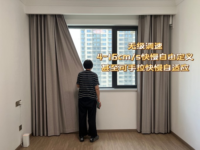 〈b〉无级调速,4-16cm/s快慢自由定义,甚至可手拉快慢自适应,避免清晨窗帘快开出现的瞬间强烈光线,整体的体验舒适度进一步提升。