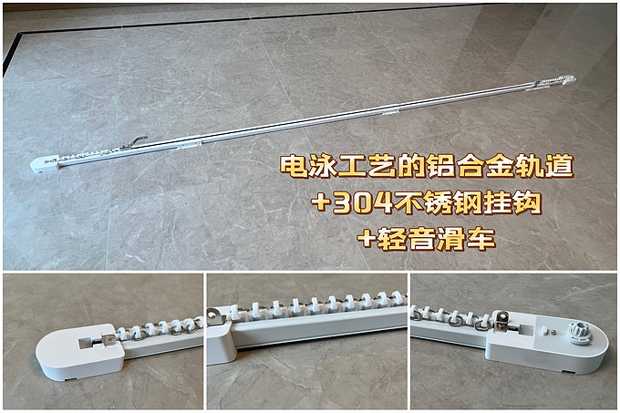 窗帘〈b〉配有3米拼接轨道,可通过购买拓展包延长至5米,减少了测量与定制的繁琐。〈b〉电泳工艺的铝合金轨道漆面很光滑,摸起来无任何鼓包毛糙;〈b〉304不锈钢挂钩和轻音滑车用料也非常厚实!