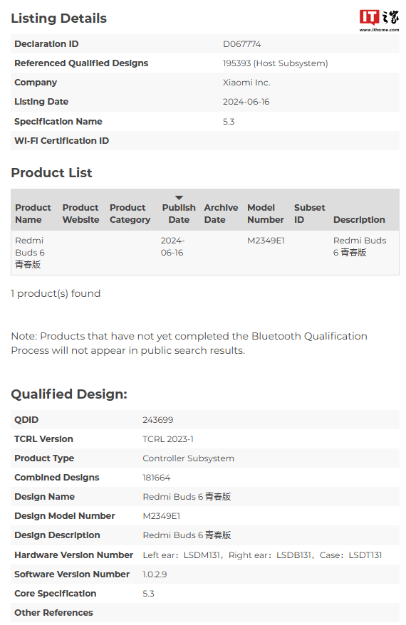 据 6 月 16 日最新媒体消息,型号“M2349E1”的 Redmi Buds 6 青春版耳机今日通过蓝牙认证,搭载恒玄 BES2600 / 2700 系列蓝牙方案。