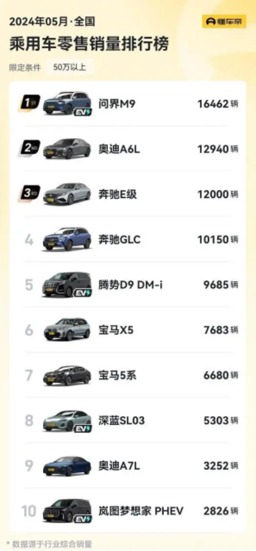 据懂车帝发布的5月份50万以上乘用车零售排行榜榜单显示,问界M9夺得第一名,销量16462台,是宝马X5销量的2倍还要多。此外,前10名榜单中,有4个国产品牌车型。