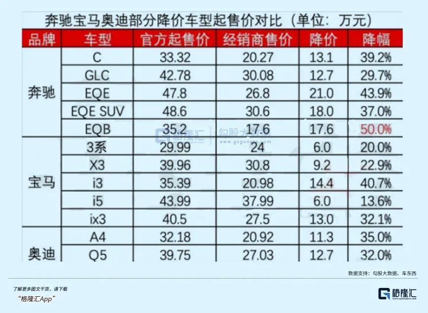 可见,BBA电车已被国产车按在地上摩擦。当然,燃油车的日子同样不好过。首先看价格,奔驰C级最低下探至20.27万元(降价13.2万元),奔驰GLC下探至30万元左右(降价12.7万元)。宝马3系跌破25万元,奥迪A4L起步价已跌破20万元心理防线。