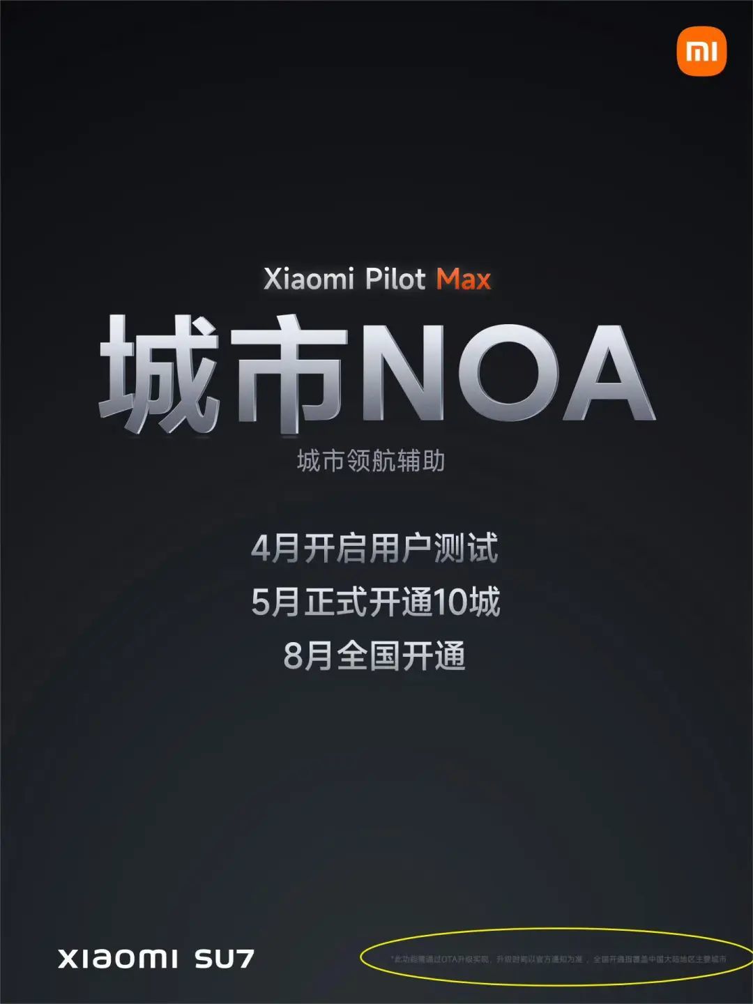 小米虽然在宣传中表示8月城市NOA全国开通,但又在小字部分注明“全国开通是指覆盖中国大陆地区主要城市”。