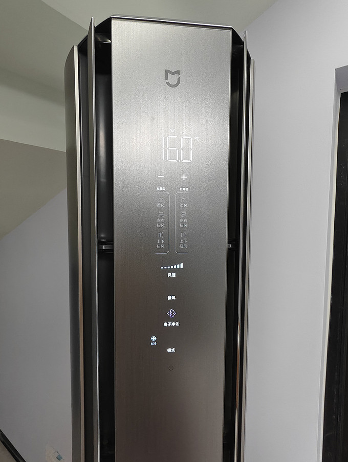第一眼颜值挺不错,开机之后的流水灯超级帅气!不同状态它会显示不同的颜色,让你一眼就能知道空调正在什么模式下运行。不过面板质感略欠,要不是写这个晒物的时候看了一眼详情页说是玻璃,我会觉得它是塑料…