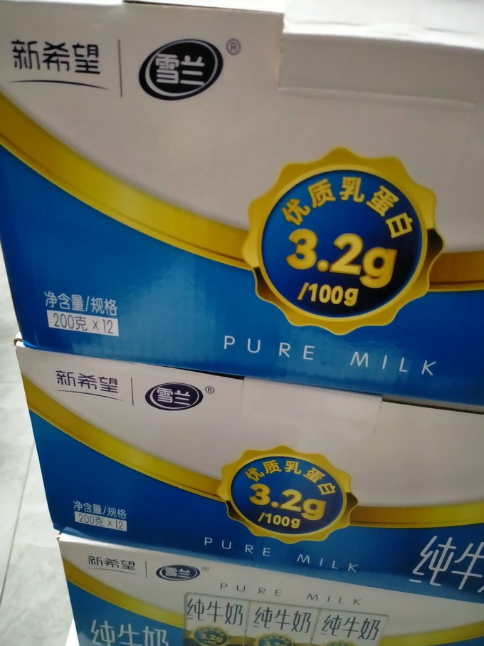 新希望云南高原纯牛奶, 12盒装的礼盒设计, 每盒牛奶均标注清晰的生产日期,日期新鲜。每盒200毫升的量也很合适。