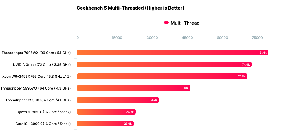 据 6 月 27 日最新媒体消息,英伟达 72 核的 Grace CPU 现身 GeekBench 基准跑分测试,性能接近 96 核 AMD Threadripper 7995WX,超过英特尔 56 核心的至强 W9-3495X。