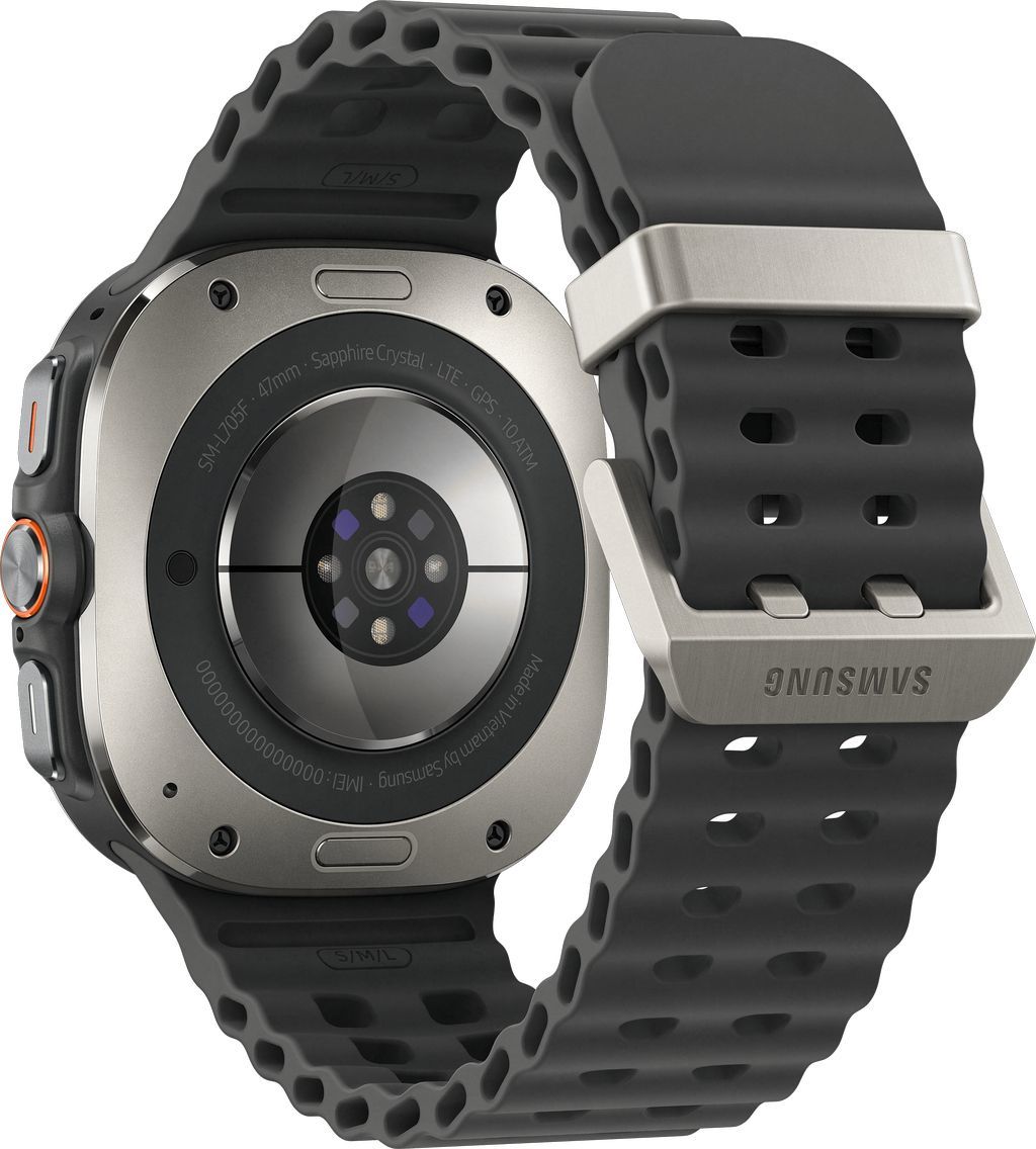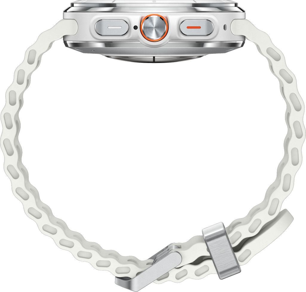 然后是更加运动的 Galaxy Watch Ultra,它也有三种颜色组合:银色搭配白色表带、黑色和深灰色双色款式以及黑色搭配橙色表带。