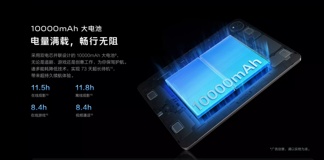 此外,vivo Pad3采用双电芯并联设计方案,搭载一块10000mAh超大容量电池,在线观影可实现11.5小时续航能力,最长待机时长可实现73天,并且平板支持最高44W有线快充。