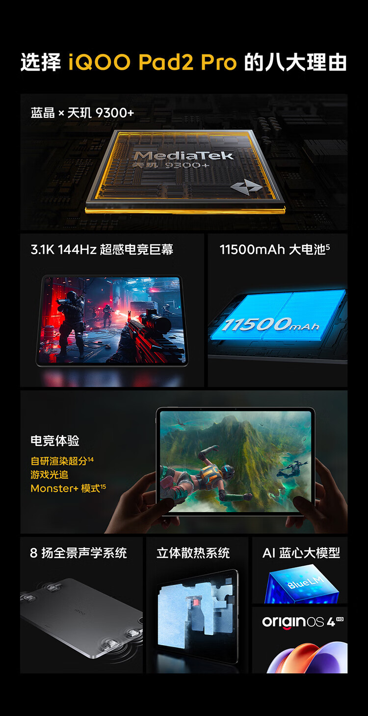 今晚的iQOO 为我们带来了 iQOO Pad2 Pro 的1TB 版。性能上蓝晶X天玑9300+处理器:作为全球首发的处理器,其跑分突破 232 万,这一成绩无疑让iQOO Pad2 Pro在性能上傲视群雄,为用户提供了极致流畅的操作体验,无论是日常应用还是大型游戏都能轻松应对。