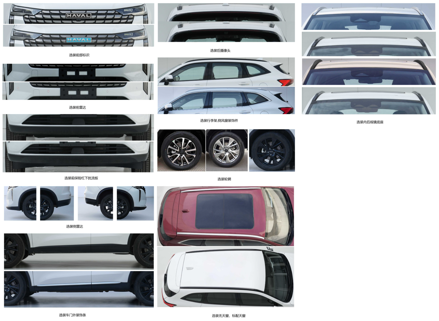 申报信息显示,全新长城哈弗 H6 Hi4 长宽高为 4703*1886*1730mm,轴距为 2738mm,总质量 2385kg,整备质量 1950kg。该车可选装前雷达、前保险杠下扰流板、侧雷达、车门外装饰条、后摄像头、行李架、侧风窗装饰件、轮辋、无天窗等配置。