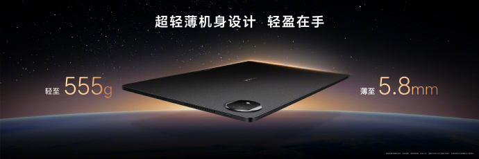 荣耀平板MagicPad 2采用超轻薄机身设计,整机轻至555g、薄至5.8mm。采用航天级羽纤后盖,宣称轻巧与坚固并存,同时是业界首款通过SGS五星抗弯折认证的平板。提供天海青、星空黑、月影白三款时尚配色,尽显色彩美学。
