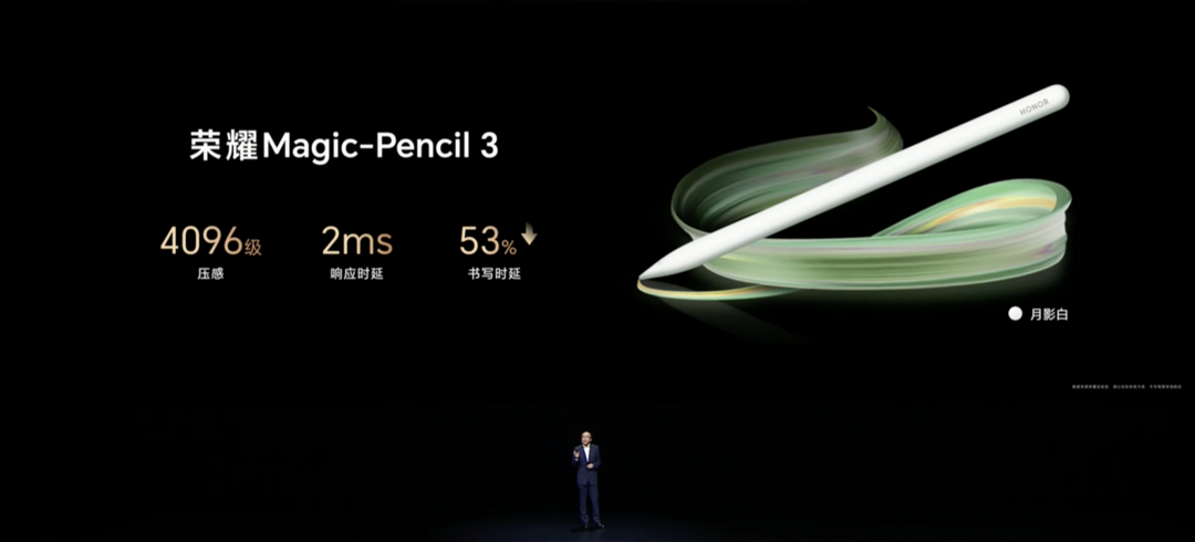 来到性能部分, 荣耀平板MagicPad 2搭载第三代骁龙8S旗舰芯片,采用4nm制程工,支持多模态的生成式AI性能。机身内置10050mAh大电池,支持66W超级快充,兼顾轻薄和长续航。此外,还带来了全新月白色的荣耀Magic-Pencil 3,支持4096级压感,零压出墨以及2ms的超低时延,书写流畅更好用。