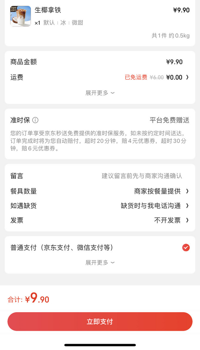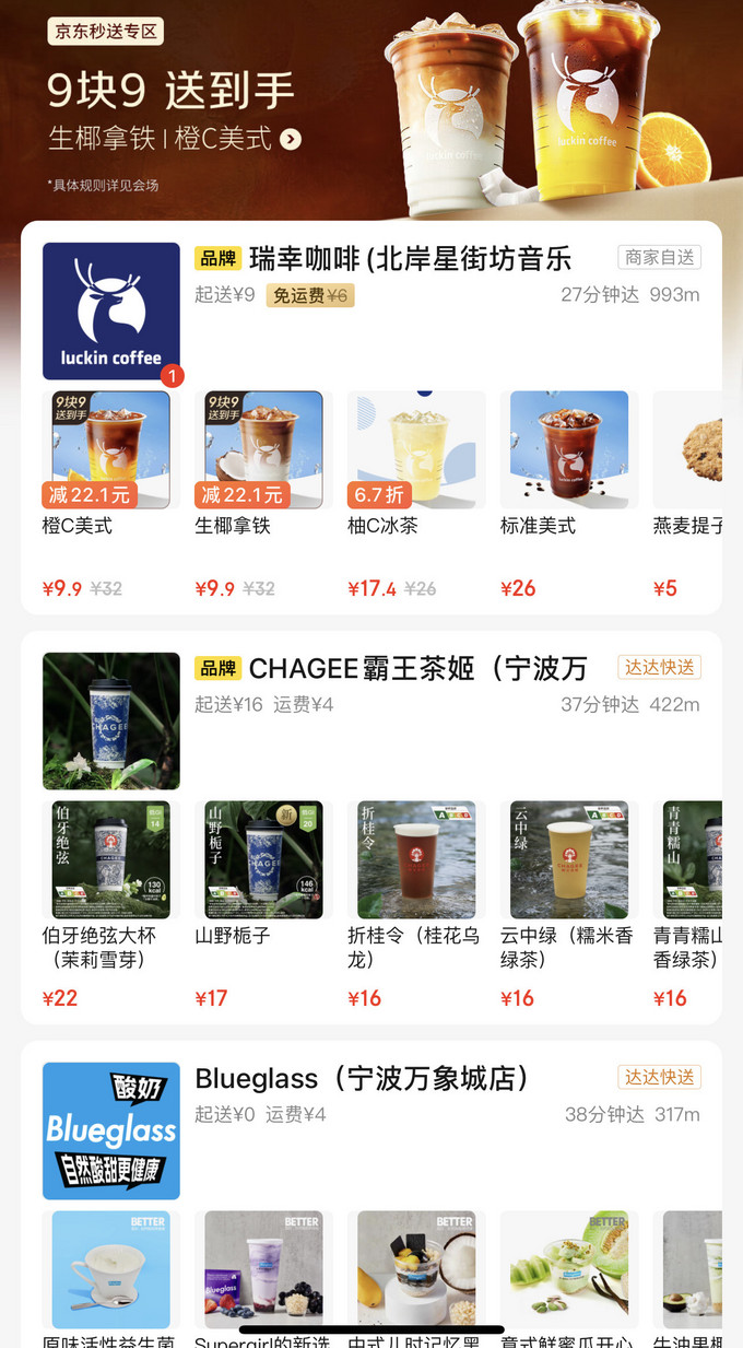 获取流程:京东APP首页顶部选右边秒送,或者直接搜索京东秒送,在咖啡奶茶页面选择瑞幸就行了,9.9元免配送费,每天都能买。不过有限定款式,目前是生椰拿铁和橙C美式。