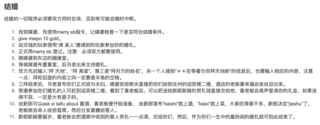 比如说结婚,玩家要从找媒婆开始,经过登记、拜堂、接待来宾,吩咐酒楼上酒上菜、餐后分发喜糖、喜老板交接宾客贺礼大概这么一套完整的流程,每一步都需要玩家操作,和现实中结婚没啥区别。