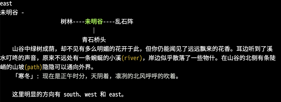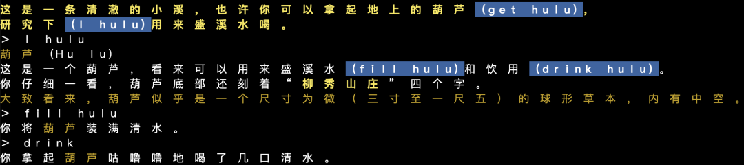 比如说在游戏新手村里刚刚苏醒的角色想要赶紧喝点水,为了完成这个简单的任务,小发先后输入 look river 、 get hulu 、 l hulu 、 fill hulu 、 drink hulu ,这才完成了从观察环境,到捡起葫芦喝水的全过程。
