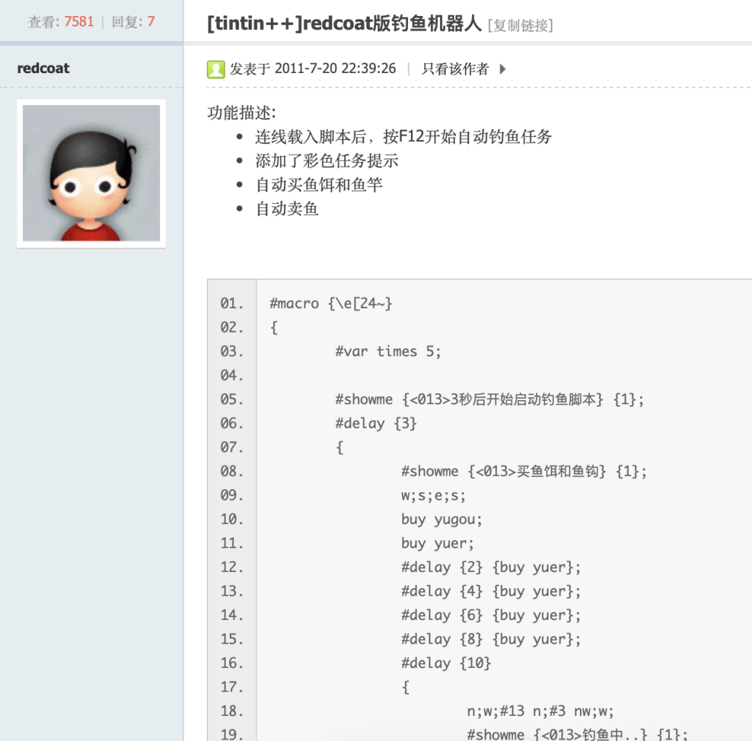 作为一款依靠文字来输入输出的老游戏,给《 侠客行 》编写机器人外挂的难度非常低。再加上游戏里本身有很多重复命令,比如读书、练功、快速疗伤等,很适合使用编程手段来代替手工操作。