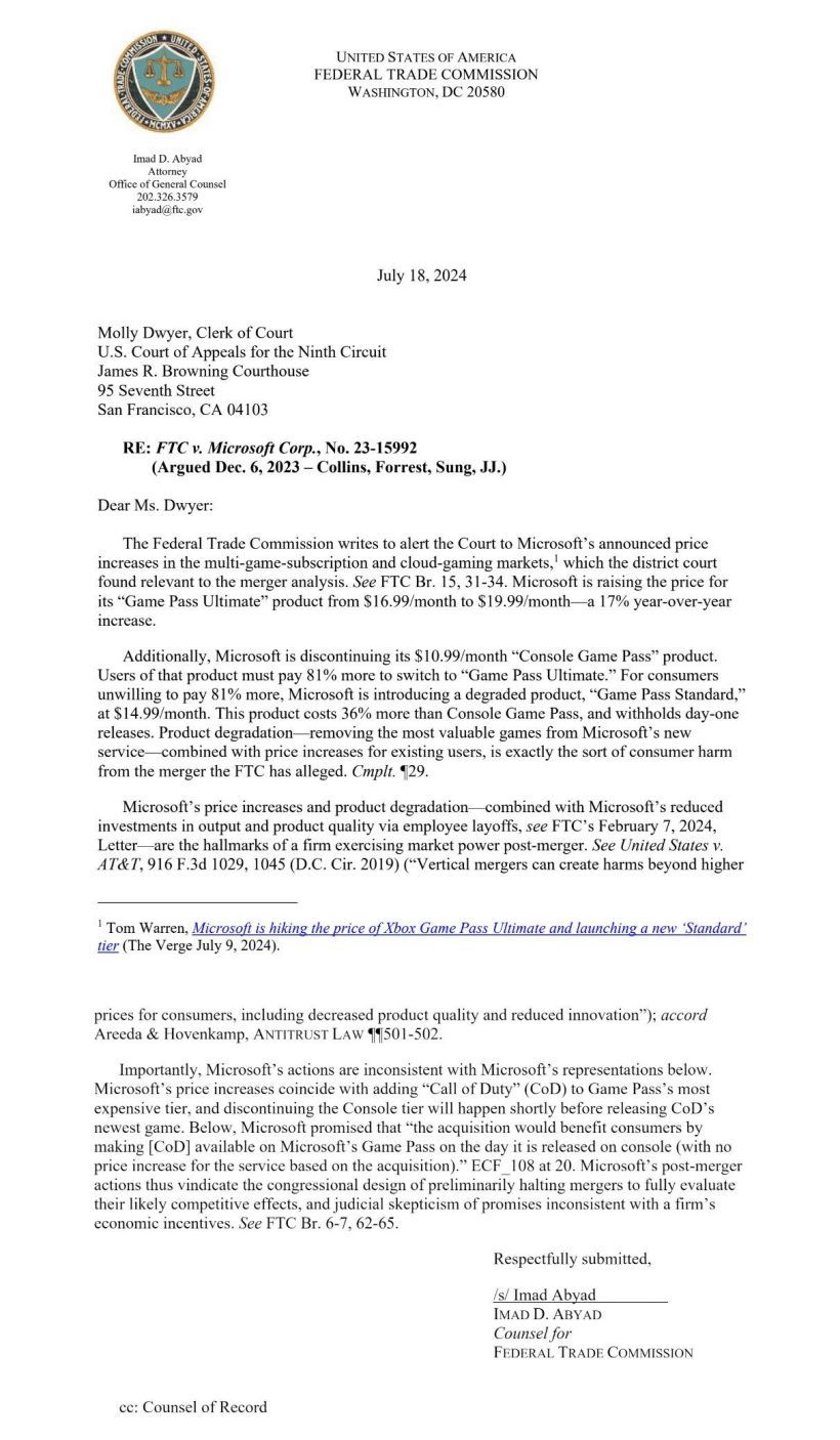 产品降级(从微软的新服务中删除最有价值的游戏),再加上对现有用户的提价,已经对消费者造成了伤害,FTC 将指控微软来维护消费者权益。