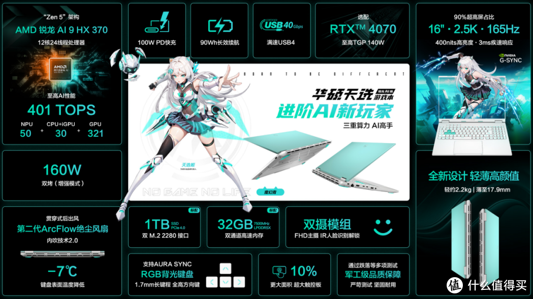 内也搭载AMD 锐龙AI 9 HX 370处理器,独显配置更高,除了可选 RTX 4060外,还可选性能更强的NVIDIA RTX 4070 笔记本独显,140W性能释放;另外,在CPU+GPU+NPU三重算力加持下,整机总算力高达401 TOPS,能游刃有余地在本地运行上百亿参数大语言模型以及复杂的AIGC应用。在AI功能方面,FHD+IR双摄组合支持面部识别、AI虚化、目光矫正以及双向AI降噪技术,给予玩家安全卓越的视频语音通话体验。