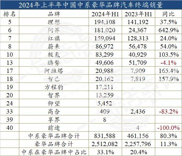 总体而言,依靠新能源高端品牌们的迅猛发展,尤其是理想、问界、蔚来、极氪、阿维塔和方程豹等自主品牌的发力,在乘用车销量仅同比增长3.6%的情况下,今年上半年豪华车共计售出251.2万辆,比去年同期增长11.3%,在整体市场中的占比也提升至25.1%。