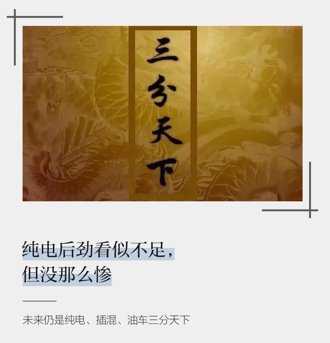第二再从消费者层面来看。你买电车和买油车或者是混动车,除非它能给你带来不一样的驾乘体验。从现在的维度来讲,如果是油车2.0T排量,包括混动的车和电车,驾乘感受上面我不认为有大家说的那么大,可能是90分和95分的差异。以前大家都对加速性的要求很高,因为以前大家靠百公里加速去体现或支撑品牌的价值,但是这个现在已经没有了,这就是为什么国产一方面技术进步,一方面品牌也上来的原因,就是因为通过电动化把这个品牌效应给模糊掉了。