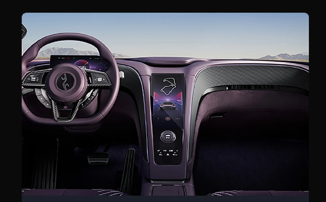 内饰方面,新车采用了大面积的碳纤维装饰和麂皮全包覆,主驾与副驾之间形成“左右镜像”的对称式布局:两边都配备一块屏幕,中控由纵向中控屏和仪表屏、副驾娱乐屏组成。同时,车内配有环绕式氛围灯、星河智能屏、丹拿铂金证据音响和多功能一体式运动型座椅。